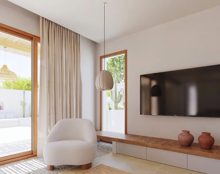 En su interior, este chalet cuenta con 3 dormitorios, uno de ellos en suite, y 2 baños y un aseo para mayor comodidad. La cocina en isla, totalmente equipada, es ideal para aquellos que disfrutan de la cocina y el entretenimiento en casa.