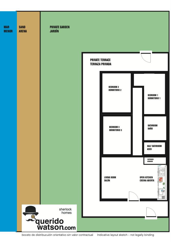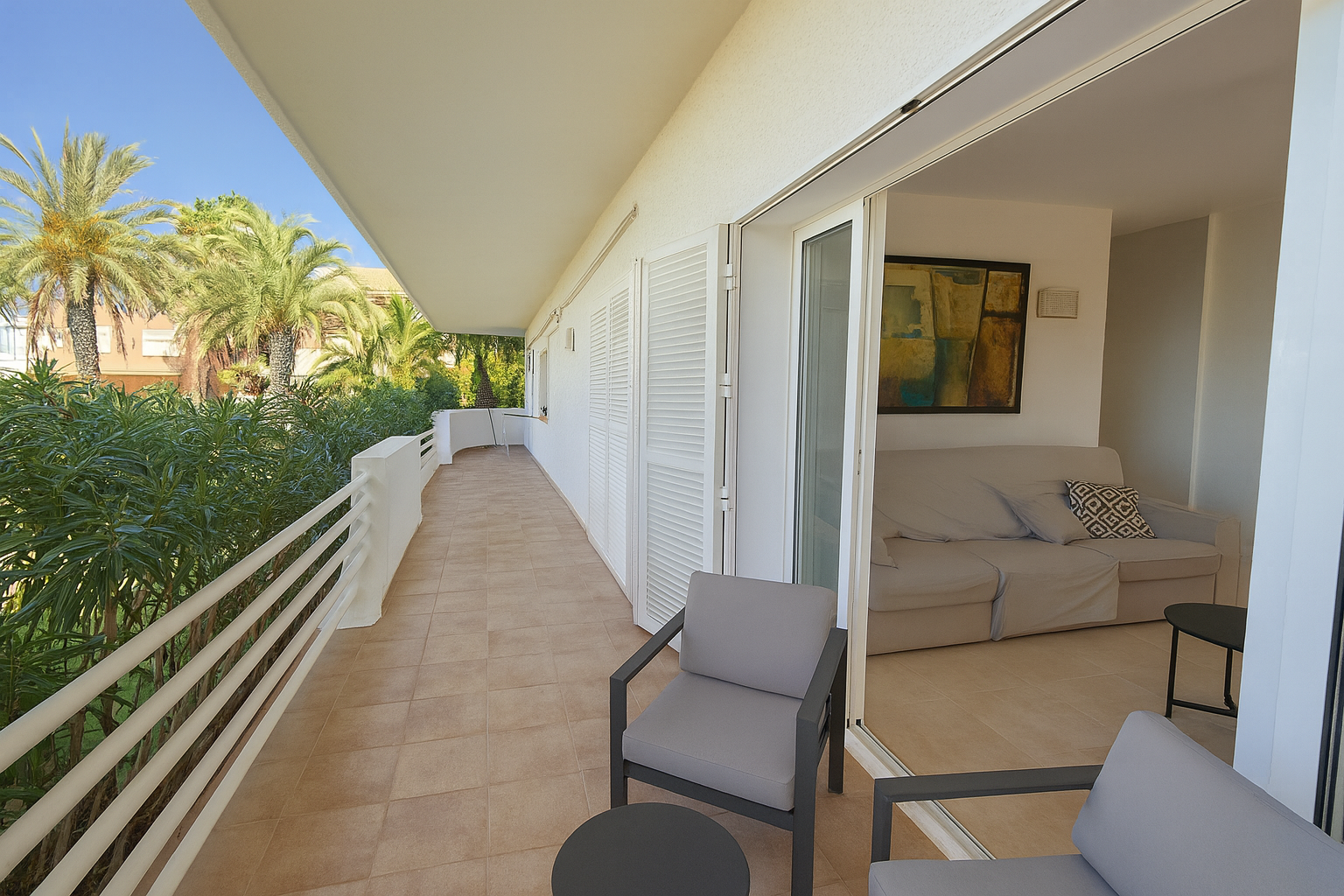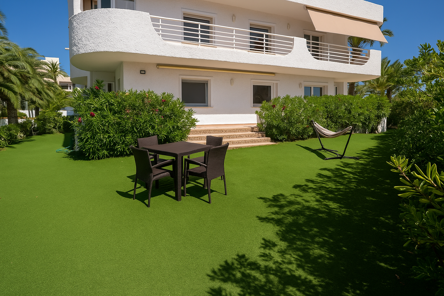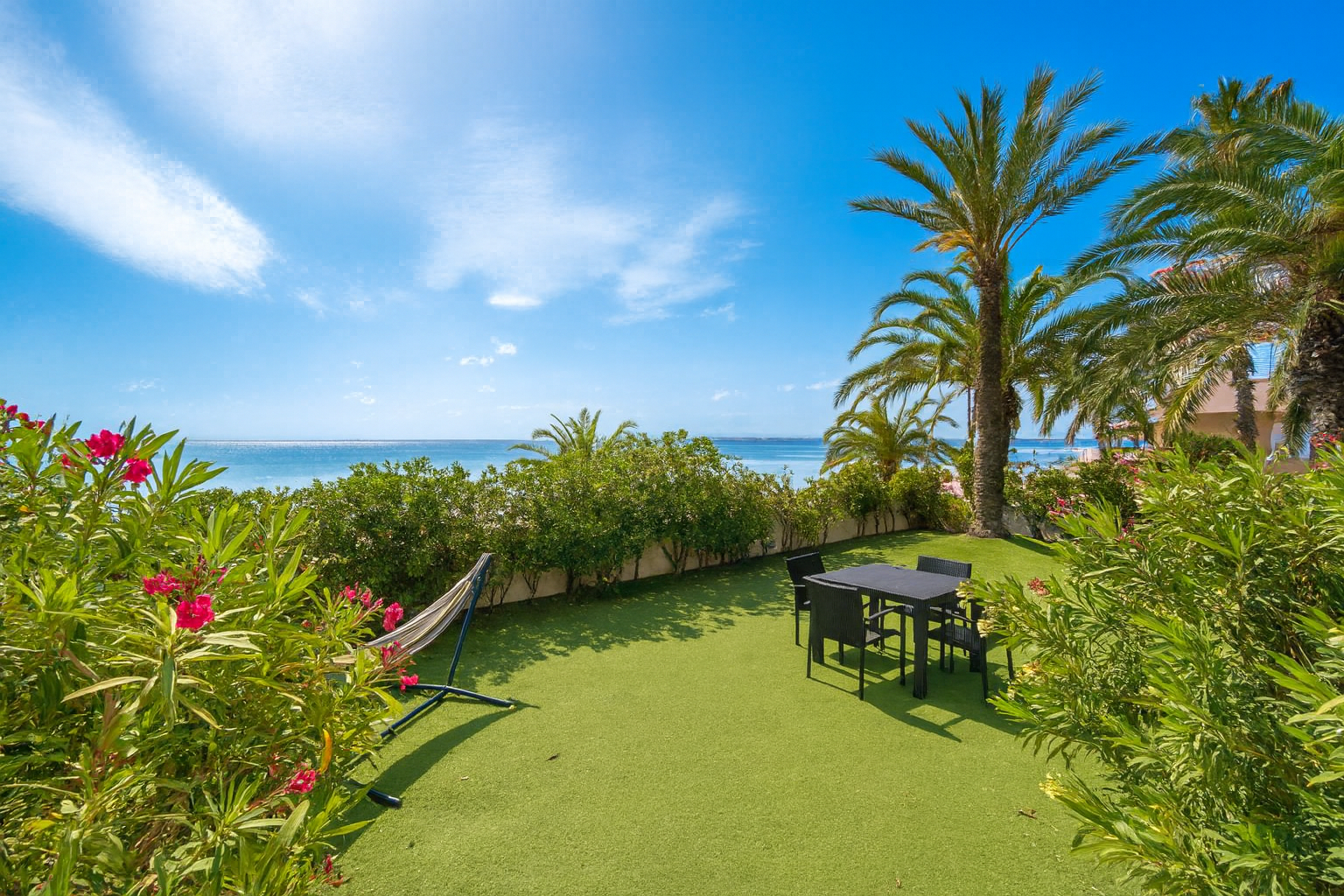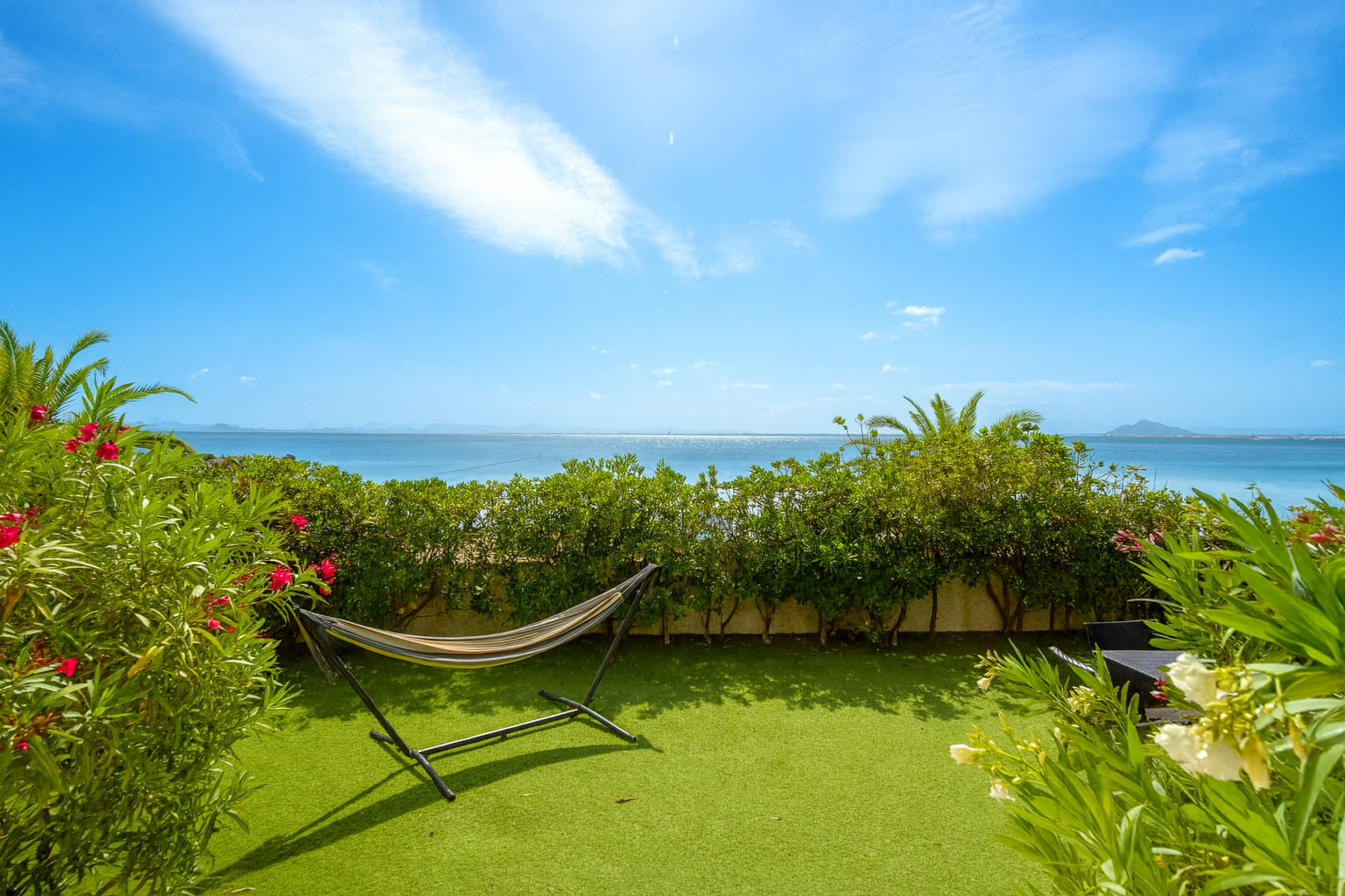 Su terraza y jardín privado son la prolongación natural de la playa: un espacio íntimo para relajarte, compartir momentos especiales y dejar que el sonido del mar acompañe cada instante.