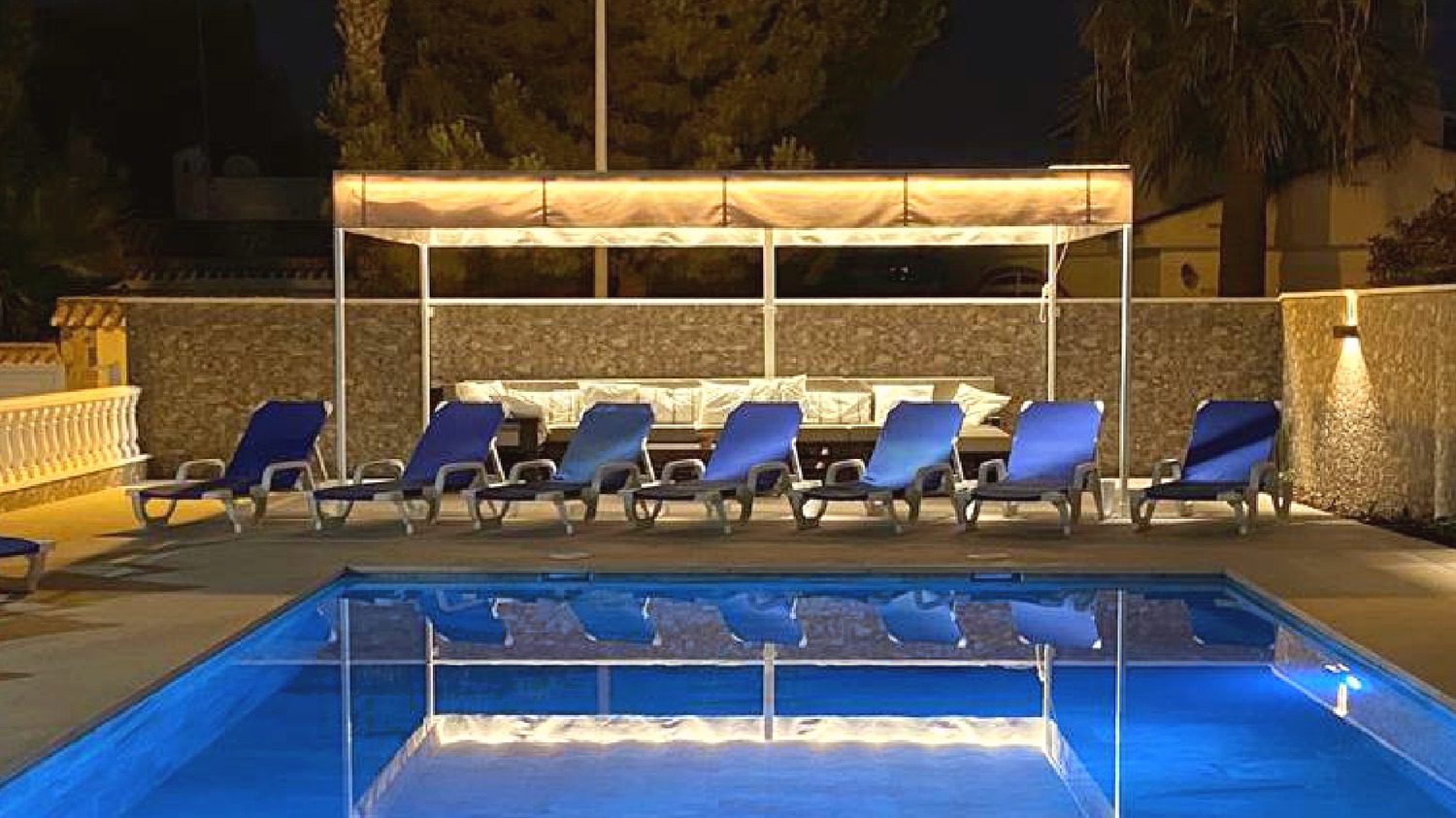 El exterior es una verdadera joya: un jardín muy bien cuidado, diferentes espacios chill out con pérgolas y zonas de sombra, y una preciosa piscina privada de agua salada con jacuzzi, que se convierte en el corazón de la vivienda.